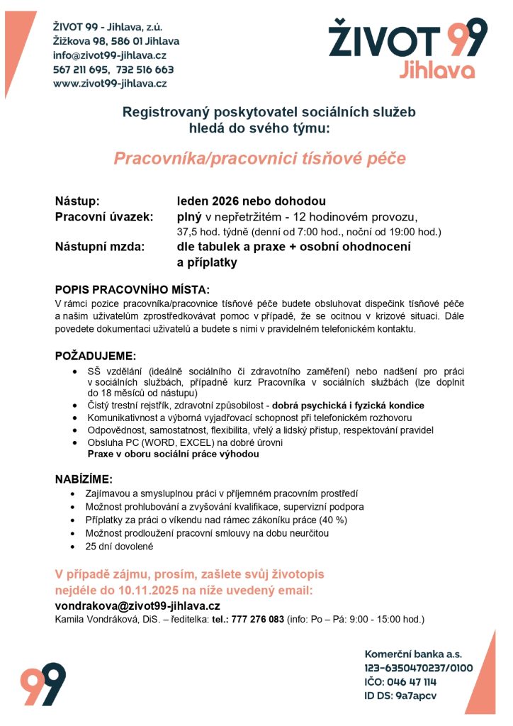 Hledáme novou posilu na pozici pracovníka/pracovnice TÍSŇOVÉ PÉČE.📞